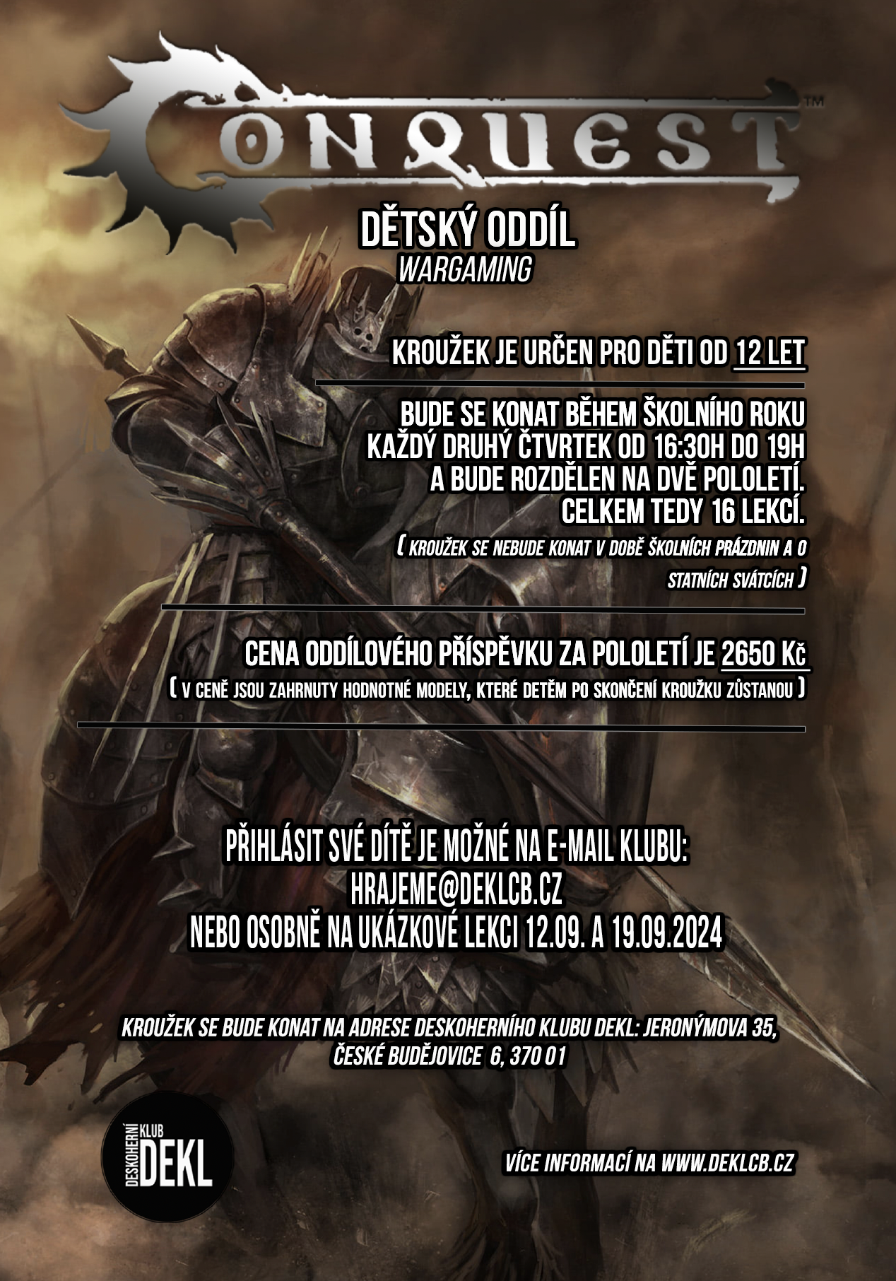 Pro zájemce jsme připravili první dvě otevřené lekce v čtvrtek 12.9. a 19.9.2024 od 16:30 do 19:00. Tyto dva termíny bude Deskoherní klub DEKL otevřen pro všechny zájemce o herně - modelářský kroužek CONQUEST zcela zdarma!